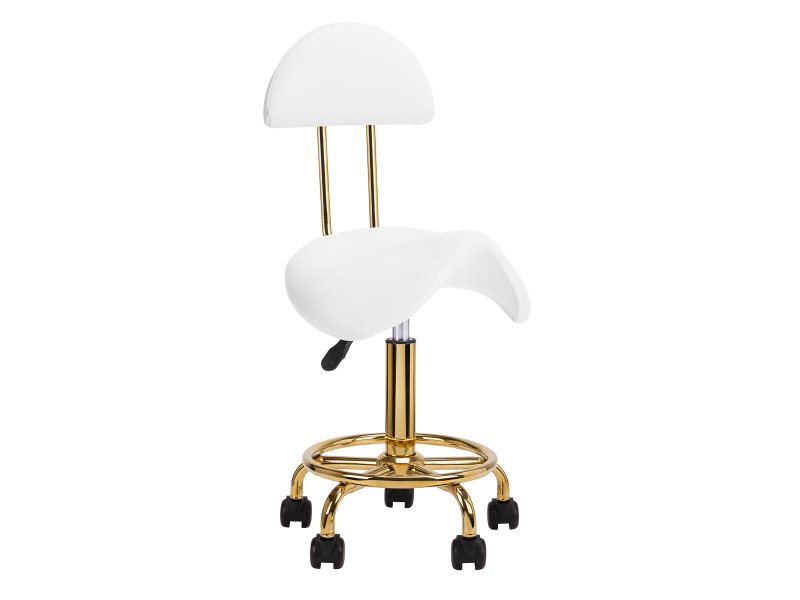 Taburete dorado ergonómico con respaldo y altura ajustable 45-60 cm, ideal para una postura saludable y elegante en espacios profesionales y hogares modernos.
