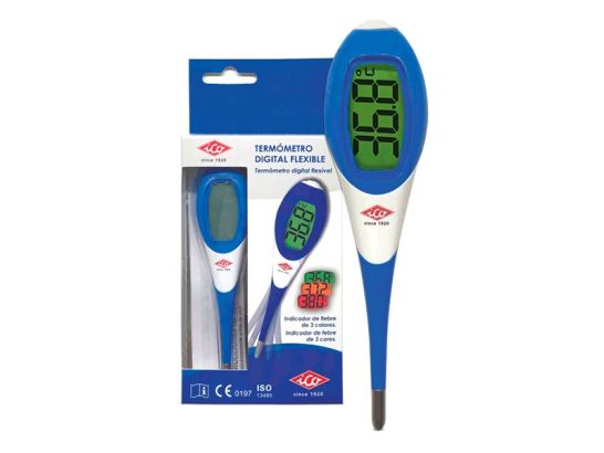 Termometro Digital Flexible ICO destinado para la medición de la temperatura corporal de niños y adultos; cuenta con una pantalla digital y está diseñado para uso en el entorno doméstico.
