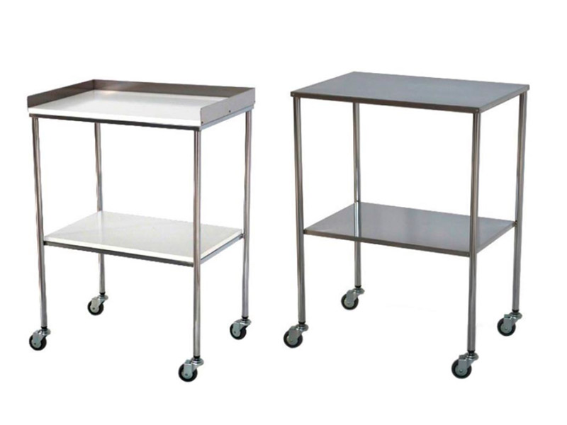 Side tehty pöytä kromattua terästä, kaksi hyllyä ja pyörät.
