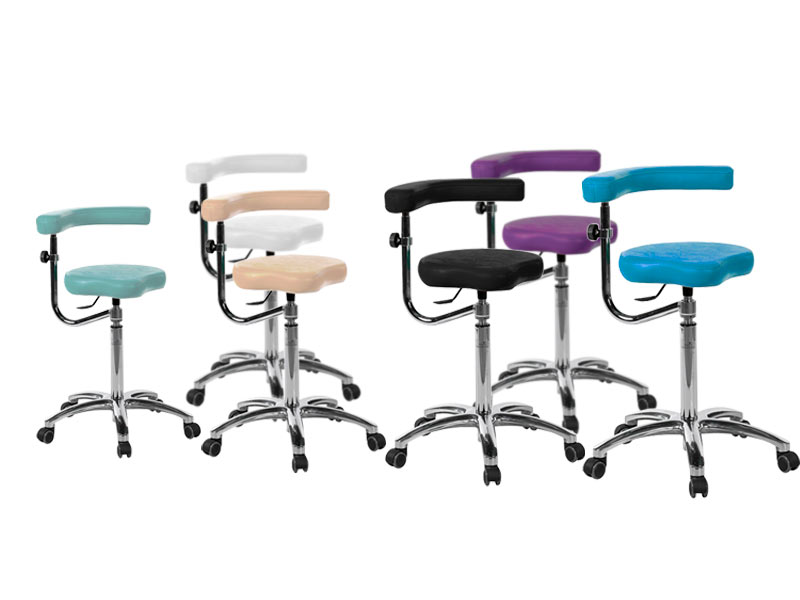 Pyöränistuimen tyyppinen satulatyötuoli, kromattu jalusta ja monikäyttöinen käsinoja