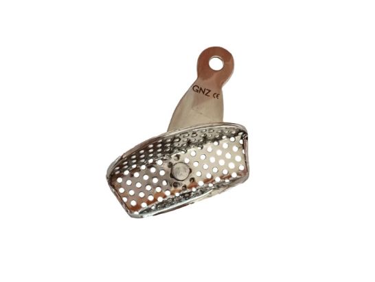 Bac giratoire en acier inoxydable perforée, idéale pour prises d'empreintes précises, durable, stérilisable et confortable pour un usage professionnel en dentisterie.