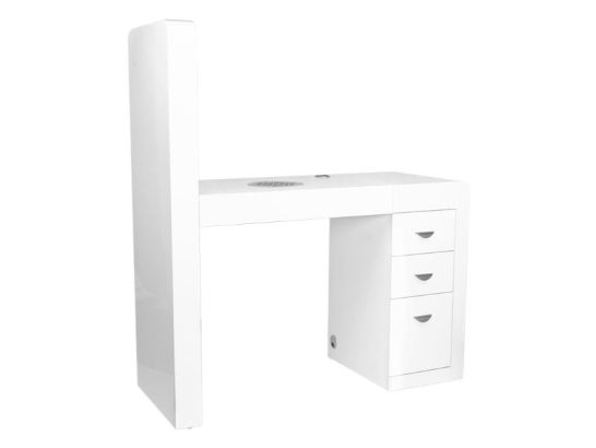 Le Bureau cosmétique blanc 310 avec absorbeur et étagère éclairée est un meuble indispensable pour tous les instituts de beauté, salons de manucure et espaces professionnels dédiés au soin des ongles et au maquillage. Conçu pour offrir une solution complète et fonctionnelle, ce bureau intelligent réunit en un seul équipement trois usages essentiels : une surface de travail ergonomique, un système d’absorption efficace pour un environnement propre, et une étagère éclairée parfaitement adaptée à la présentation et au rangement des vernis, accessoires ou produits de beauté. Ce mobilier moderne s’intègre parfaitement dans les intérieurs contemporains grâce à sa finition blanche élégante et ses lignes épurées, apportant à la fois fonctionnalité et esthétique à votre espace de travail.