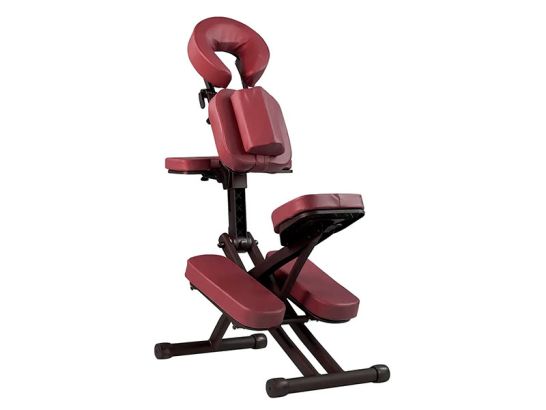 Chaise de massage pliable SORA Deluxe en Bordeaux, compacte et ajustable, livrée avec accessoires pour un confort optimal à domicile ou en pro. L'essentiel du bien-être!