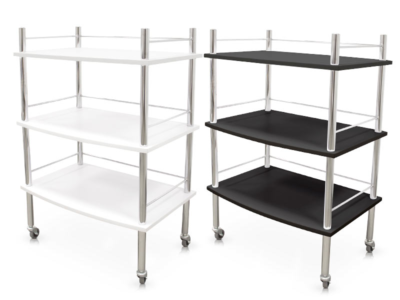Chariot simple et fonctionnel pour centres de beauté, de beauté et de coiffure avec structure en métal chromé, 3 étagères en bois et roulettes. Disponible en noir et blanc