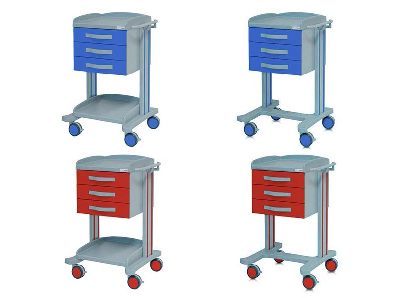 Chariot multifonctionnel avec 3 tiroirs supérieurs et poussoir.