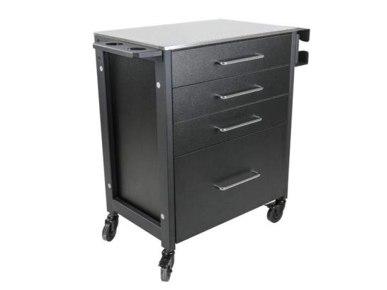 Chariot DENVER robuste à 4 tiroirs, avec plan inox hygiénique et roulettes frein. Parfait pour salons de beauté et professionnels exigeants en mobilité et rangement.