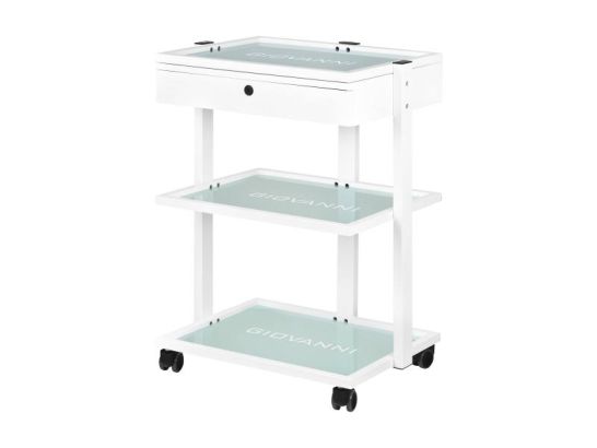 Chariot multiusage blanc en acier et verre, avec roues pivotantes, robuste et mobile, idéal pour professionnels recherchant organisation et style dans leur espace de travail.
