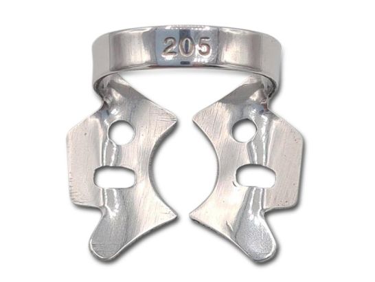 Clamp odontologique 205 en acier inoxydable, assurant une isolation précise et confortable pour un champ opératoire parfaitement sécurisé lors de soins dentaires.