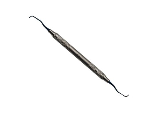 Curette Gracey 11/12 en acier inoxydable, pointe bleue et revêtement titane pour un détartrage précis et durable des molaires. Ergonomique et facile à stériliser.