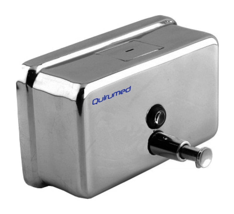 Distributeur de savon liquide, horizontal, fixé au mur.