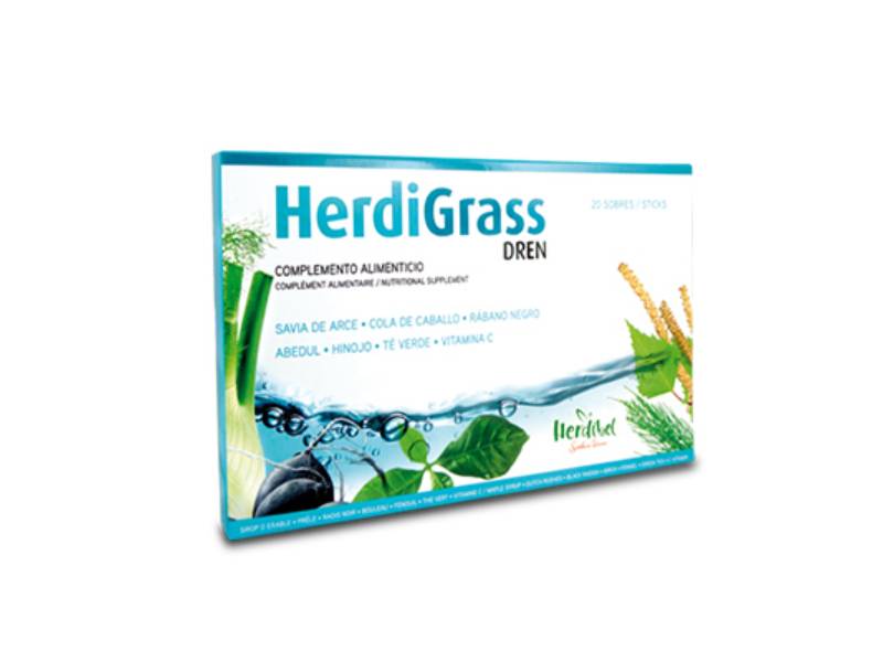 HERDIGRASS DREN, aide à éliminer les toxines et l'excès de liquides. Stimule le système immunitaire, réduit la fatigue avec des vitamines et des extraits herbacés.