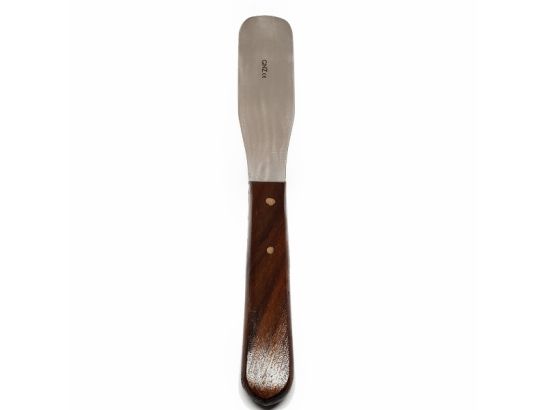 Spatule courbe en métal inoxydable avec manche en bois, idéale pour mélanger et appliquer l'alginate avec précision et confort.