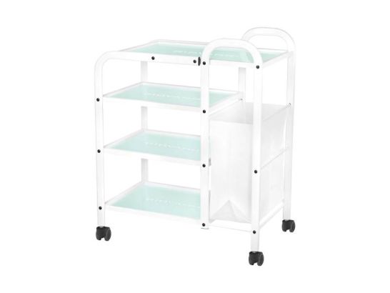 Table cosmétique Giovanni 1031 en métal et verre, équipée de 4 étagères gravées, roulettes mobiles et sac intégré pour un espace de travail élégant et fonctionnel.