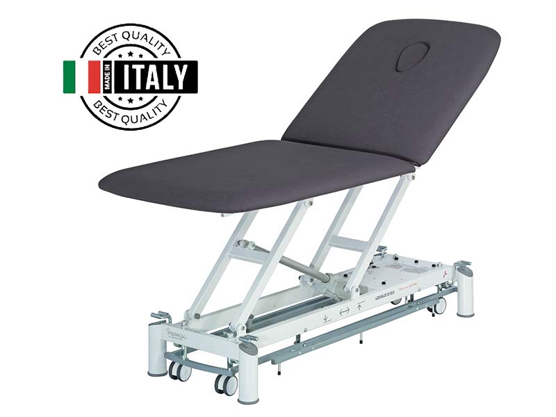 Table de kinésithérapie électrique à deux plans largeur 80 cm avec dossier de 84 cm inclinable verticalement et hauteur variable grâce à un moteur électrique de 8000 N.