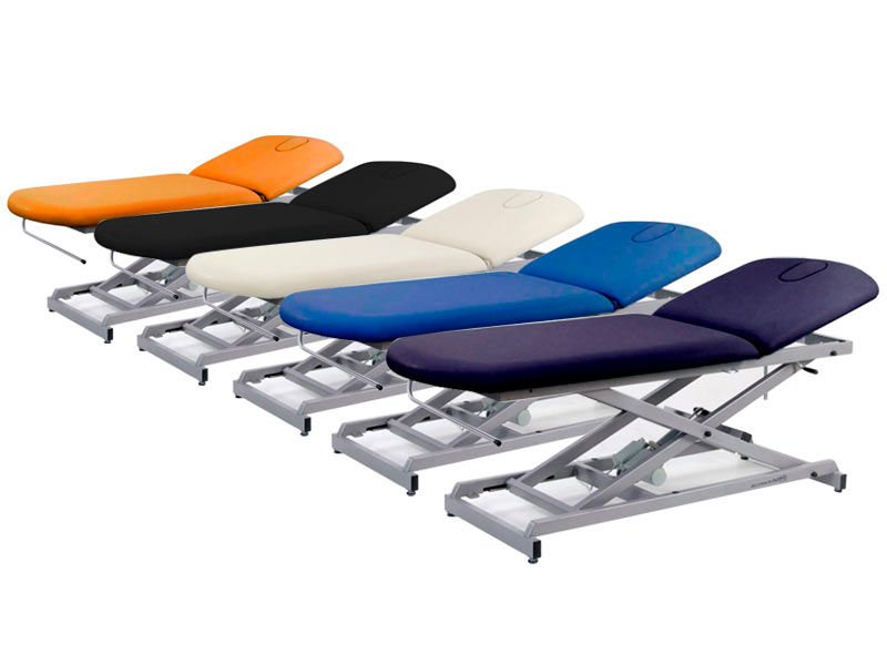 Brancard électrique 2 sections à montée droite sans déplacement latéral, avec calotte faciale et porte-rouleau.