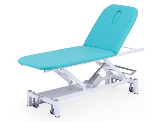 - Table électrique professionnel à deux sections pour traitements et visites médicales avec tête de Table de 70 cm réglable en positif au moyen d'un piston à gaz.