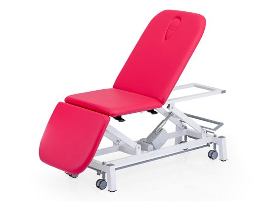 - Table électrique professionnel en trois parties pour traitements et visites médicales avec dossier et repose-pieds réglables par pistons à gaz.