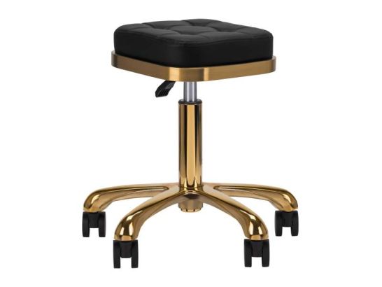 Tabouret cosmétique noir et doré, réglable en hauteur avec roulettes, alliant confort, mobilité et élégance pour les professionnels de la beauté.