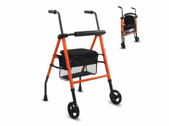 Deambulateur 2 roues en aluminium, siège confortable et sac pratique. Idéal pour retrouver mobilité et autonomie, avec style et sécurité à chaque pas. Modèle Nerón en orange.