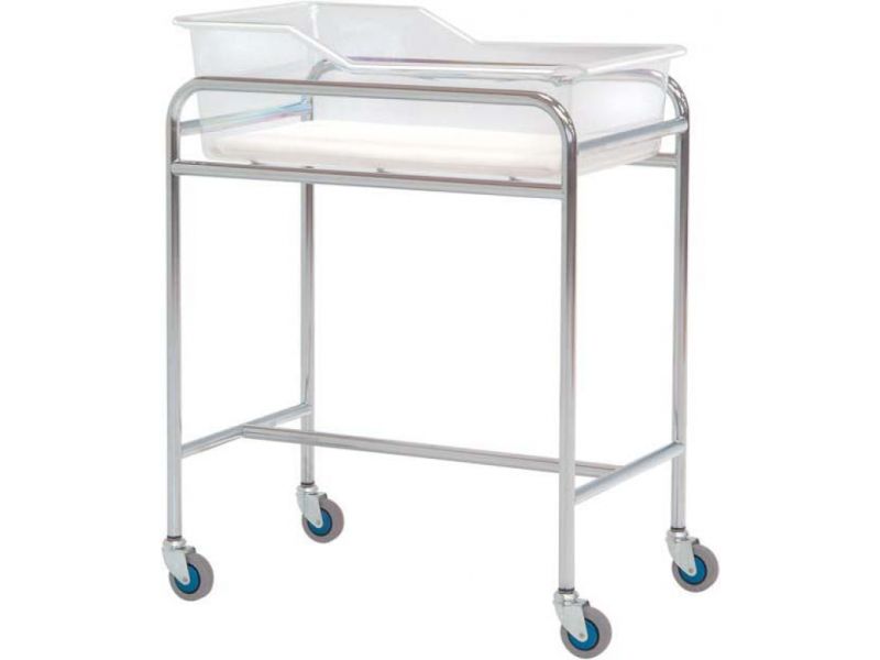 Κούνια νοσοκομείου για νεογνά σε κλινικές και νοσοκομεία. Το χρωματιστό ατσάλινο πλαίσιο με τροχούς και πλευρικές λαβές διευκολύνει τη μεταφορά μεταξύ των δωματίων. Η φωλιά, φτιαγμένη από μεθακρυλικό, μπορεί να εξαχθεί και να καθαριστεί μετά τη χρήση της.