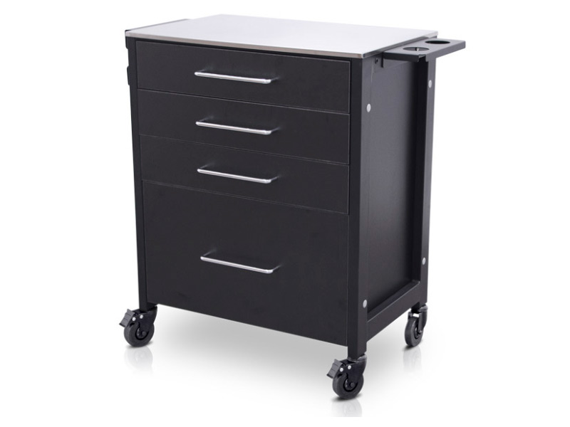 Σταθμός εργασίας τατουάζ , βασικός με στηρίγματα για μελάνι και γάντια. Ευρεία επιφάνεια στήριξης, 4 ξύλινα συρτάρια μεγάλης χωρητικότητας και τροχοί με σύστημα φρένων σε δύο από αυτά. Το πλαίσιο είναι κατασκευασμένο από βαμμένο ατσάλι σε μαύρο χρώμα, μαζί με την επιχρωμιωμένη επιφάνεια και τις λαβές, παρέχουν ένα πραγματικά δροσερό και επαγγελματικό φινίρισμα στο προϊόν.