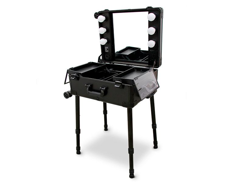 Μαύρη θήκη επαγγελματικού μακιγιάζ σχεδιασμένη για χρήση οπουδήποτε, χάρη στη λαβή μεταφοράς και τους 4 περιστρεφόμενους τροχούς 360º που το καθιστούν μια άνετη και ελαφριά θήκη για καροτσάκι. Μεταμορφώνεται σε μπουντουάρ, χάρη στα 4 πόδια και τους 6 λαμπτήρες LED με ρυθμιζόμενη ένταση φωτός και έναν τέλειο καθρέφτη. Διαθέτει επίσης είσοδο USB για φόρτιση άλλων συσκευών. Μόλις κλείσει, καταλαμβάνει πολύ λίγο χώρο αφού τα τηλεσκοπικά πόδια μαζεύονται εύκολα. Στο εσωτερικό, έρχεται εξοπλισμένο με 2 κουτιά με αφαιρούμενα γυάλινα καπάκια για τη διαμόρφωση του χώρου όπως απαιτείται, καθώς και πολλές θήκες διαφορετικών μεγεθών, όπου μπορείτε να μεταφέρετε όλα τα προϊόντα μακιγιάζ σας άνετα και με ασφάλεια.