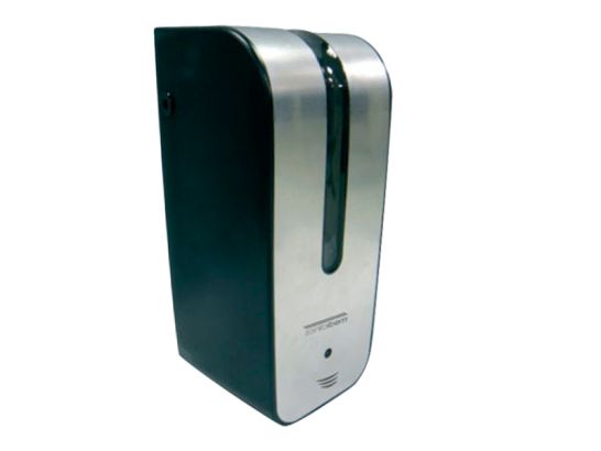 Automatic soap dispenser for a vertical surface, silver and black