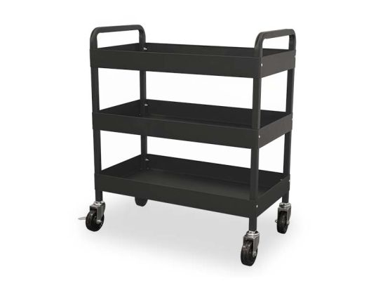 Black steel auxiliary trolley for tattoo studios, hairdressers and barbershops. It is equipped with three large trays in which you can place the usual work tools as well as the different products in a practical and simple way. It has four 360º rotating wheels, two of them with braking system, to be able to transport and handle it lightly and comfortably.
