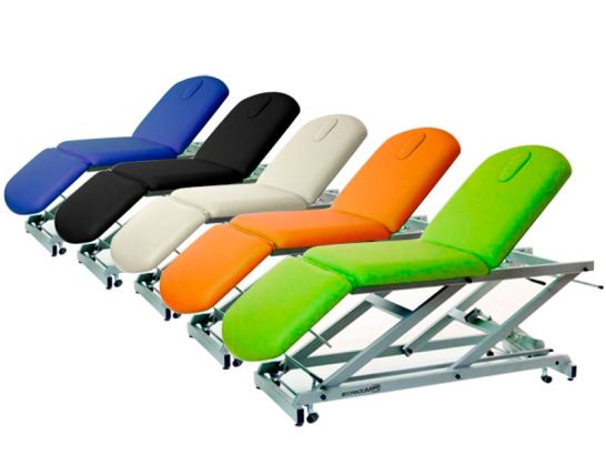 Three-section electric treatment table with paper roll holder, face padded plug and retractable wheels.