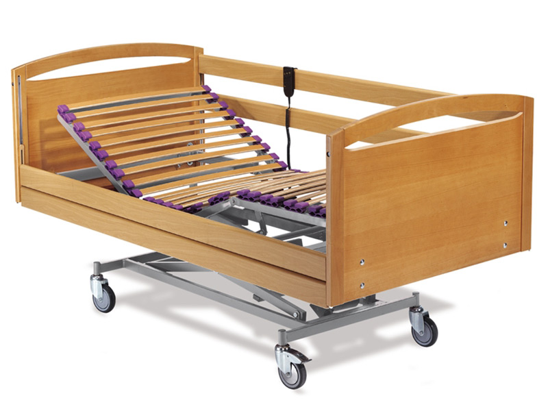 High-low electric hospital bed 190 cm long with wooden frame.