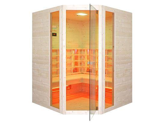 Indoor corner sauna made of high quality fir wood , with infrared technology and capacity for up to 4 people . Equipped with chromotherapy, radio, MP3 and Bluetooth . It includes 8 halogen emitters with a total of 2800W of power and control panels for all its functions.