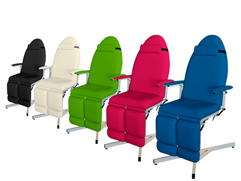 Fixed height podology couch with extendable leg sections, adjustable headrest and fold-down armrests.