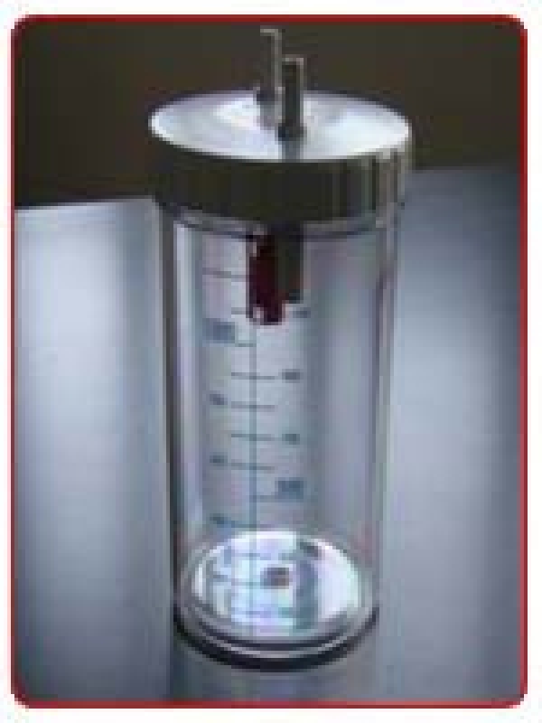Glass with cover for surgical aspirators NEW ASKIR and NEW ASPIRET. It allows for storing all the mucosities and secretions of the patient. It has 1-litre capacity and is sterilisable in autoclave at 121 ºC.