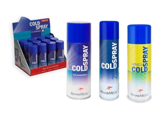 Cold spray RehabMedic is indicated as an emergency and first aid treatment for soft tissues injuries, such as sprains, distensions or tearing of the fibres. Its cooling effect starts immediately and lasts 15 minutes approx. It is also indicated as a first aid treatment in minor burns.