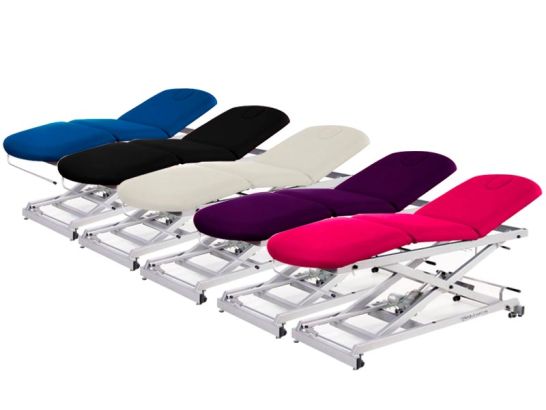 Electric examination stretcher with 3 sections, with central fold, straight rise without lateral movement, with retractable wheels, facial cap and toilet paper holder.