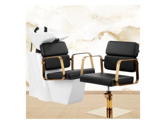 Set parrucchiere nero oro con lavaggio e poltrona ergonomica, design elegante e materiali premium per comfort e stile nel tuo salone professionale.