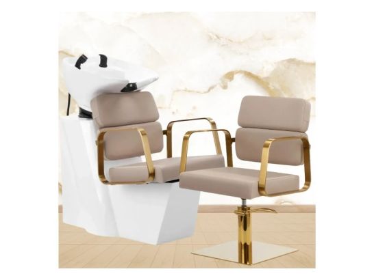 Poltrona e lavatesta beige con finiture oro, comfort ed eleganza per saloni di lusso. Design esclusivo e materiali di alta qualità per un’esperienza unica.