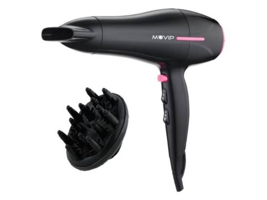 Capelli perfetti in poco tempo con l'asciugacapelli Muvip 2200W: potente motore DC, 2 velocità, 3 temperature, aria fredda e gancio pratico.