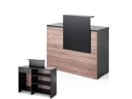 Banco cassa reception elegante in nero e marrone per parrucchieri e centri estetici. Dimensioni 115x45x100 cm. Funzionale e duraturo, ideale per ogni spazio di lavoro.