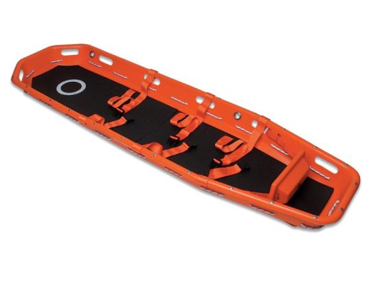 Barella in politene alta densità con materasso e poggiapiedi, leggera e manovrabile, ideale per trasporti sicuri in situazioni di emergenza e soccorso.