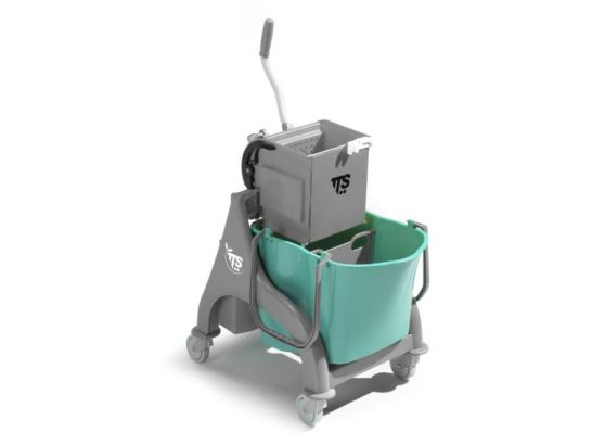 Carrello grigio in plastica monolitica, resistente e funzionale, capacità di 28 Lt. Ideale per pulizie professionali, con strizzatore O-Key e ruote per facile manovrabilità.