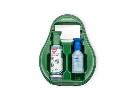 Stazione Lavaggio Oculare Dual Drop: sicurezza e prontezza per gli occhi in situazioni di emergenza. Include 2 flaconi sterili e specchietto per un intervento efficace.