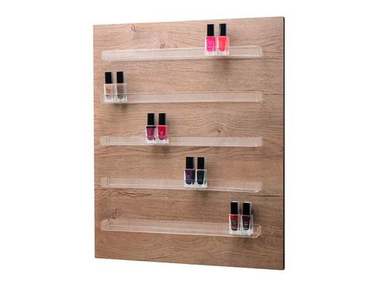 La struttura frontale è dotata di cinque ripiani in plexiglass termoformato, studiati appositamente per contenere e mantenere in ordine circa 80 bottiglie di smalto (la capienza può variare in base alle dimensioni delle bottiglie). I ripiani trasparenti garantiscono massima visibilità dei prodotti, facilitando la scelta dei colori da parte dei clienti e l'accesso agli smalti per l'operatore. Grazie al design a strisce sottili e alla stabilità del plexiglass, le bottiglie restano sicure e ben posizionate, senza rischio di cadute.