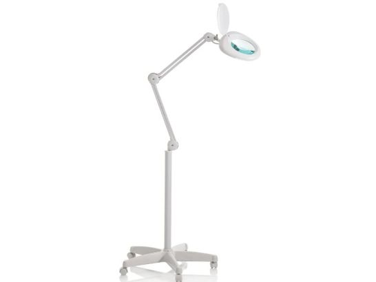 Lampada LED con lente ingrandente 5 diottrie, stativo stabile e luce uniforme, ideale per trattamenti estetici precisi e professionali.