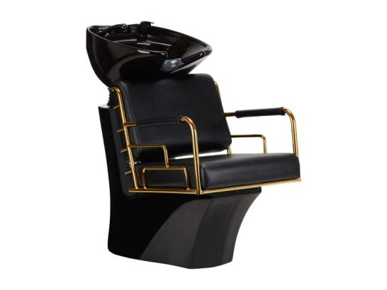 Lavabo parrucchiere Prato Gold, eleganza dorata e seduta in eco-pelle nera per massimo comfort e stile in saloni moderni e raffinati.