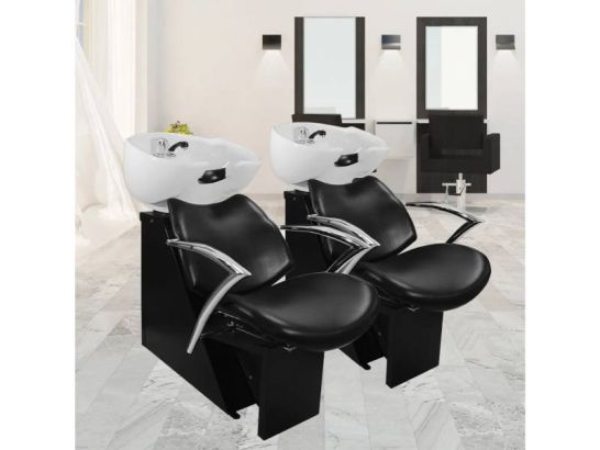 Poltrona lavaggio parrucchiere ergonomica in eco-pelle nera con doccetta e miscelatore integrati, comfort e design moderno per saloni professionali.