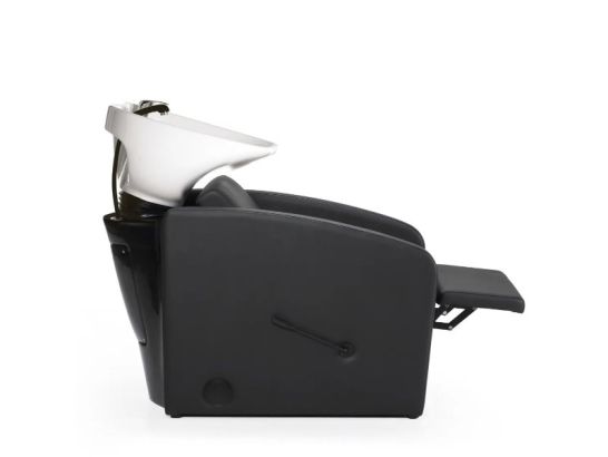 Poltrona lavatesta Sun Plus con vasca basculante in ceramica, alzagambe e rivestimento in ecopelle, per un comfort e design superiori nei saloni professionali.