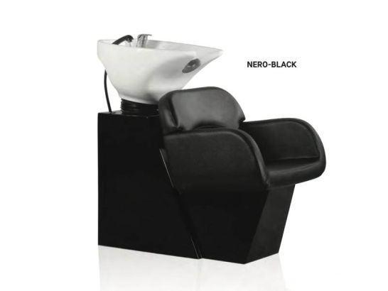 Lavatesta elegante per parrucchieri con poltrona in pelle "Sage" e vasca ceramica basculante. Comfort e stile per una perfetta esperienza di lavaggio dei capelli.