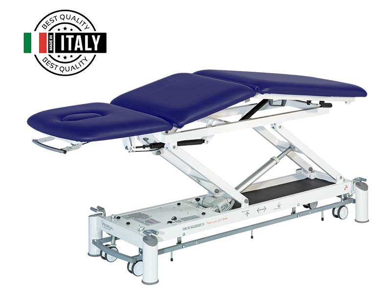 Lettino elettrico per fisioterapia e osteopatia a tre sezioni con testiera regolabile in proclivio e declivio. Altezza variabile tramite motore elettrico da 8000 N, dotato di secondo motore da 4000 N per la funzione di cifosi. Con pulsantiera.
