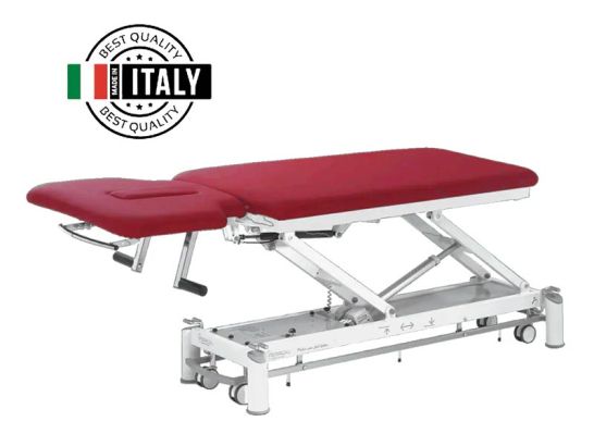 Lettino elettrico per osteopatia a due sezioni con testiera regolabile in proclivio e declivio, densità imbottitura HR75 (molto rigido). Altezza variabile tramite motore elettrico da 8000 N attivabile con pulsantiera.